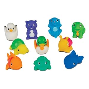 The Ten Squirting' Lake Buddies by Munchkin float and squirt water to keep your child entertained with friends from the lake, bathing your child will be a piece of cake. Great for little ones 9 months and above and right sized for their little hands.